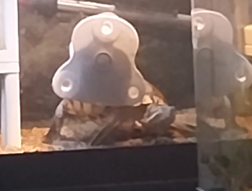 I tried moving it into her little shelf-house, so that the top of it is weighted down by the rocks on top, but she has yet to use it in this position.