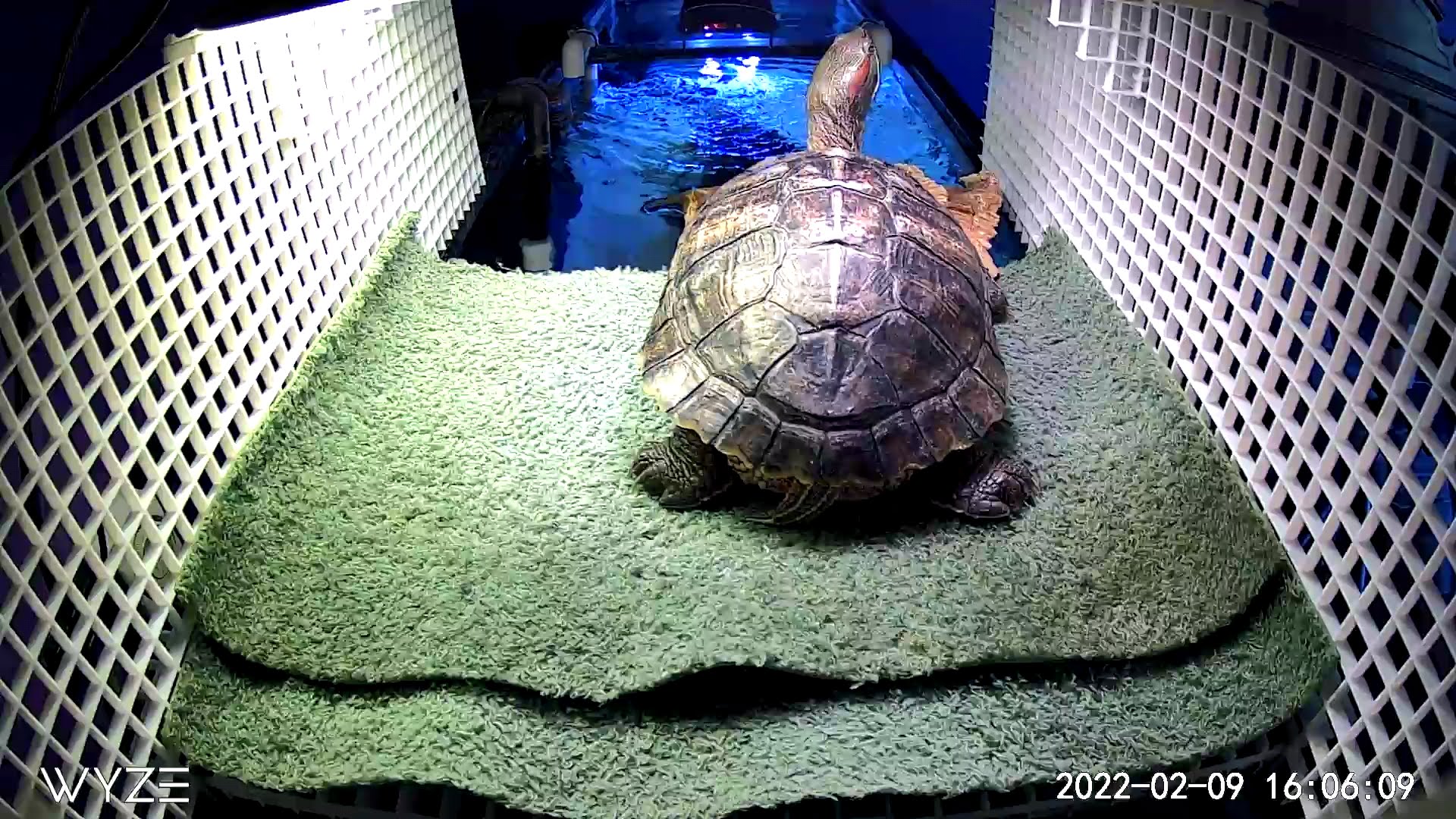 The camera caught a problem I hope I fixed last night, but it depends if RES have short memories. I caught her "falling off a log" after her bask. Apparently, she's having trouble getting back into the water; poor thing digging and reaching for wood with her left hind while hanging on with her right. There's a small hump right at the top of the log I think she was getting hung on. She crashed into the water flat on her back with a "ker-plunk". The fix was turning her log over, so I'll have to see if she'll forget about falling and go back up there. The ingress/egress is now flat. She did not leave her bottom resting spot today.