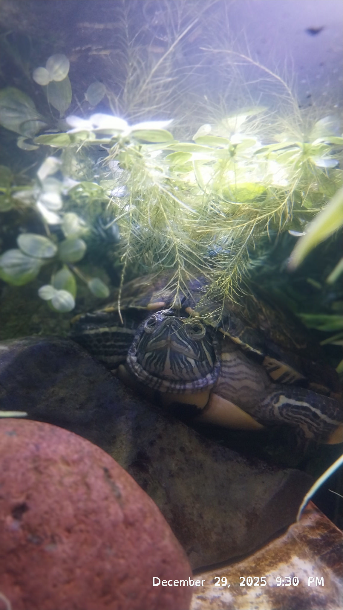 She really likes this random drawer organizer shelf thing I put in the tank!! She likes to rest on the rocks I put on top of it and poke her head out of the water, as well as hang out in the lower sections. As a bonus, it forces her to slow down when coming off of her ramp instead of slamming into the glass, which has become very nerve-wracking as she's gotten heavier!