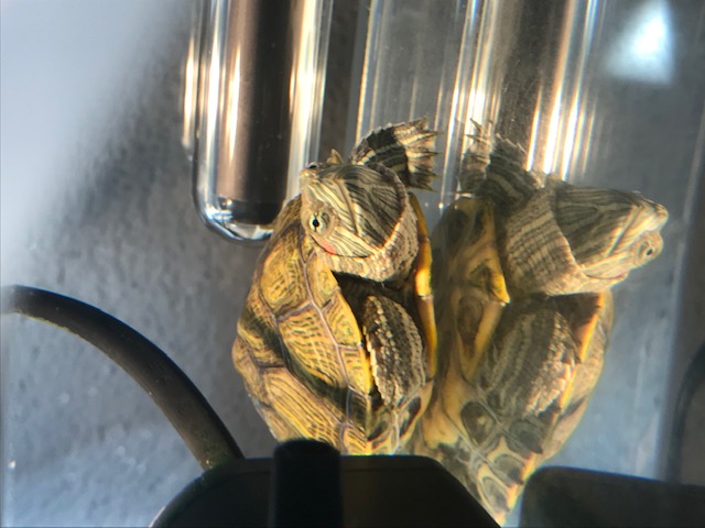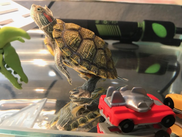 For only being with turtles 1 year you are way ahead of some others in this hobby. I preach observing well , some don't get it and only see a turtle when it's feeding time. Since they can't talk there actions are the only way to communicate with us. He/she sounds happy , good job ! Doing turtle things . Will be showing more of it's ways down the road. Watch and there will a day there's something he like's only in it's place. My Piggley would always move this one piece of driftwood . I tied it to a brick when he was 5" big to see what would happen. I put it all the way on other side of the tank... I watched for a hour , using his front legs a few pushes , when they got tired used his back legs then his left side then right side . All the way back to where it was. That was with a regular brick tied to it ! Being back where he wants it , the brick is now off , he has never moved it again or I . He won !!! Even as a 1" baby he was like that but too small to move big things. Didn't stop him from trying , so I adjusted. Center hole in that driftwood is one of his sleeping spot's and the top is his feeding area. It's a stock tank and my chair is next to it. I hang my hand in it above that driftwood and he sit up there playing with my fingers. He has a dry dock to watch TV on. I train a baby with a TV on to get use to the noise. Now Piggley wants the TV on all day , he like most shows. His basking area is located were he can watch TV also.