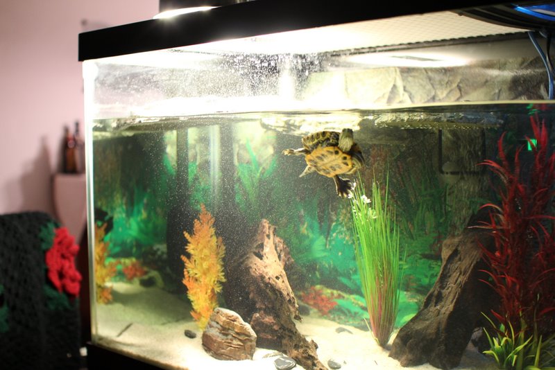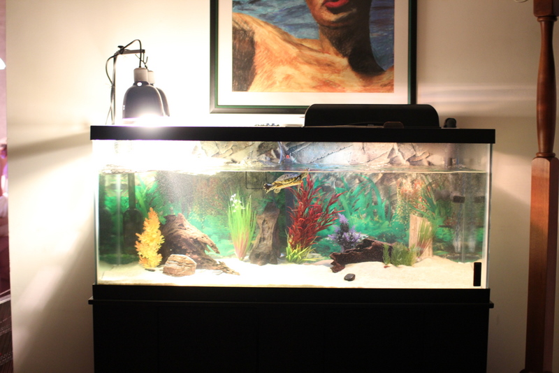 Hardware: 75 gallon tank (21"H X 48"W X 18"D), FX5 filter with veipacray media setup, pool filter sand substrat, TurtleSafe halogen heat/UVA lamp and ReptiGlo 5.0 UVB lamp in ZooMed Dual Dome Fixture.