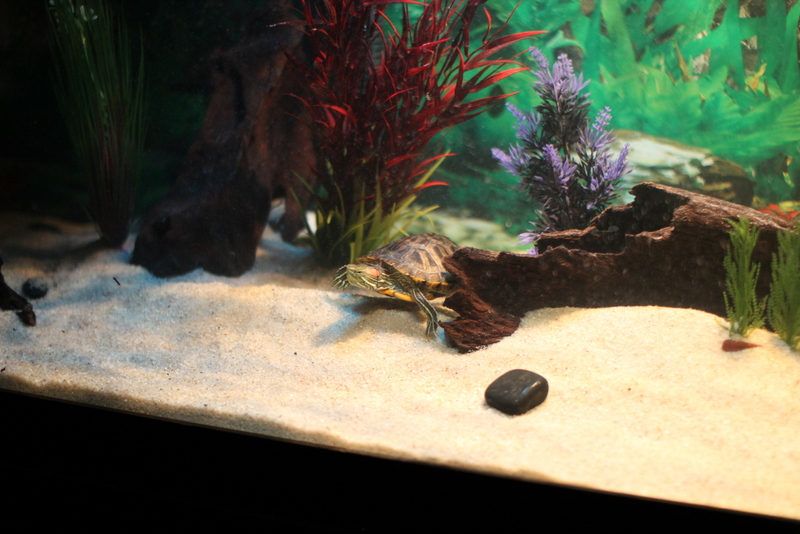 Thanks, everyone Jordtim seems to really like it, and it is extremely low maintenance, I haven't had to do anything to it since I set it up at the end of August except add some water about once a week. Although I have added some more decorations (plastic plants, driftwood, and rocks) and used ClearView on the background, before the ClearView, the background was just a grey blob below the waterline.
