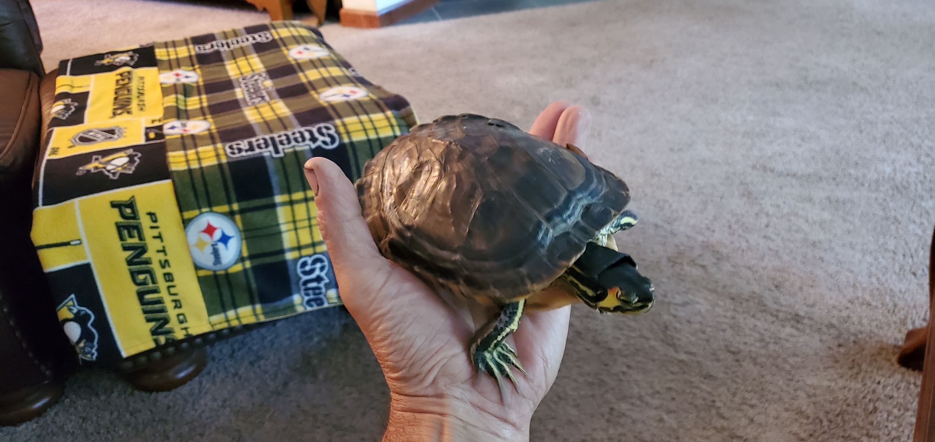 So he’s been a hermit most of his life. He spends more time outta the water than in it. He’s only in maybe 5 hours a day max -usually only about 3 to 3 ½ hours. He sleeps under the couch and has free run of the house. For the last 3 years, he goes anywhere and everywhere he wants and he’s typically not a problem. He gets to go outside for walks in the yard too. He constantly wants to be up on my lap or up on the couch with me. He likes having his neck rubbed underneath and a lot of times I’ll rub my nose under his neck. He loves it. He likes to sleep on my chest or my shoulder when I watch TV at night. Some days he chases me around the house when I’m working, always getting into my stuff or trying to climb on me if I’m on my knees doing something. He chases the sweeper and basically has no fear. Loves sitting on the couch and up on my shoulder or sleeping on my lap.