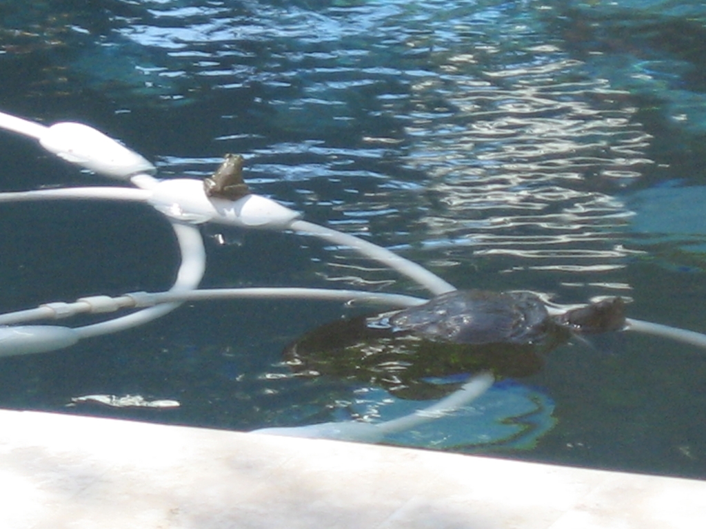 He is still a mover and shaker. Bangs on his 15 gallon heated bedroom, with double pool coping tile dry dock, at dawn each day to announce he wants out. He either goes directly to his 55 gallon playroom or the 9200 gallon salt water pool. On some days we rinse and towel him off so he can crawl around the tiled sunroom and kitchen. So far no accidents be he loves to explore. He is no slouch on speed either.