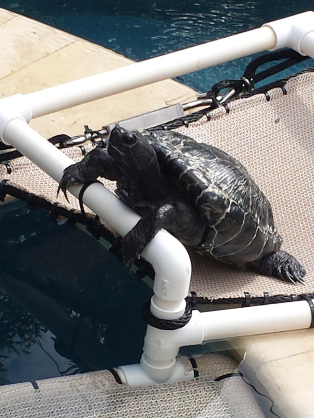 Built him a PVC bridge with mesh landing pads over the spillway from our ground level spa to the pool. No instructions were needed by Toady. Within 5 minutes he had gone back and forth a few times as if he had done it a thousand times before. Last year I added a "sun deck" to his bridge. We had seen RES in a park all basking on large boulders rising from the ponds so figured he might like a place to get out and dry at his leisure. The stretchy fabric hammocks him a bit, and along with the railings on the bridge, keep him from going to the edges of the wall between spa and pool to make a clean get away to the pool landscaping. His owners were taught this lesson a couple of times when he was not found after being left on the spillway.